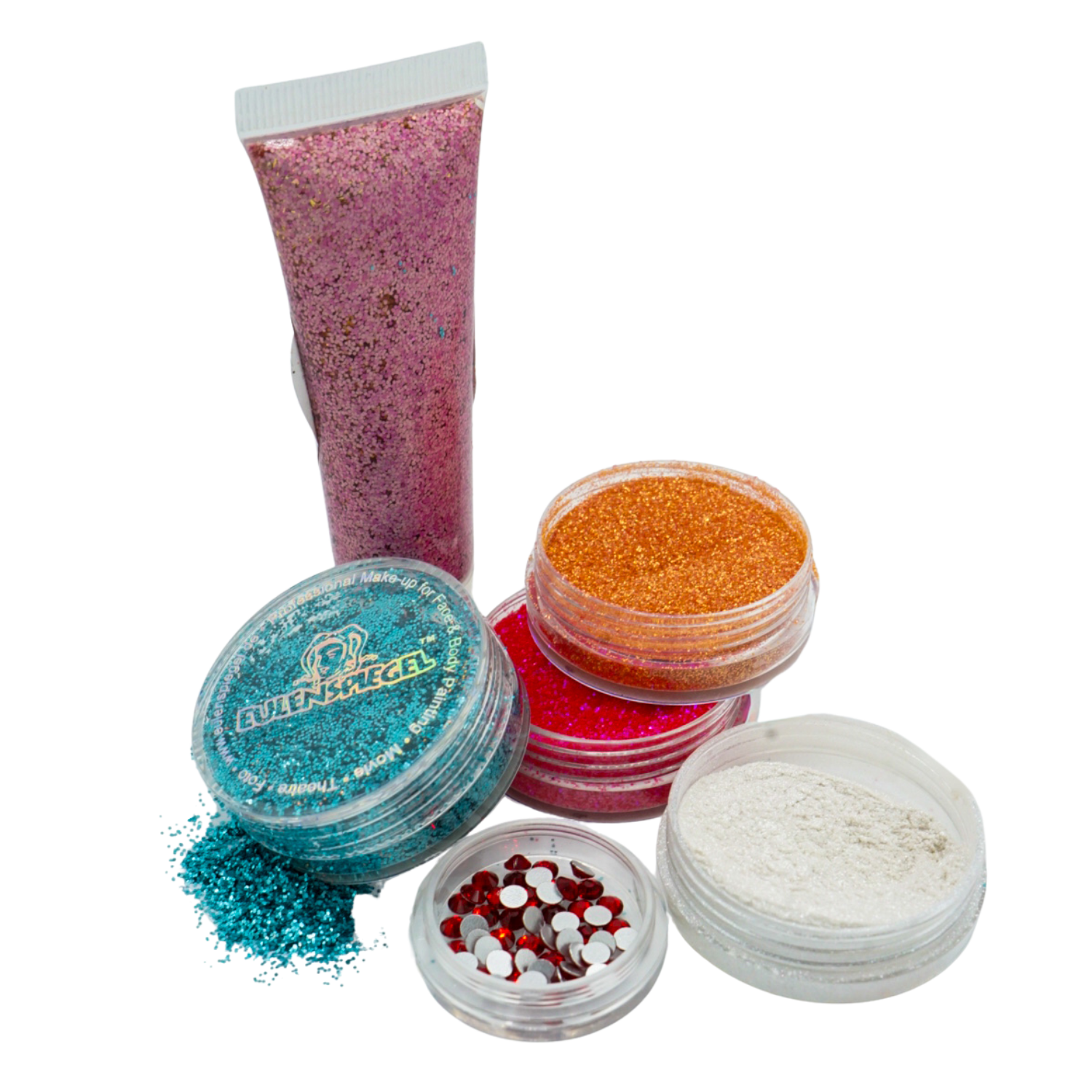 Professionelle Cremeschminke für Theater, Film, Photo, Karneval, Larp und viele andere Events. Geeignet für Haut und Latexapplikationen. Tragen Sie die Schminke mit dem Pinsel für feine Konturen und mittels eines Schminkschwamms für größere Flächen auf. Glitzer einfach auf die gewünschte Stelle streuen.